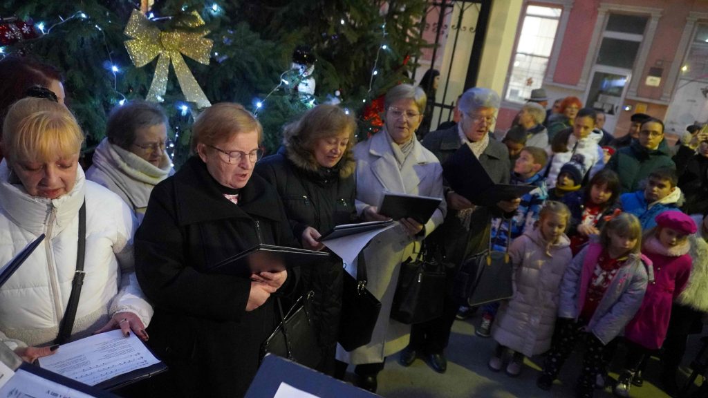 O 16h sa novosadský pán farár Branislav Kulík a predsedníčka centra Vierka Marčoková Cerovská prihovorili návštevníkom, a spoločne zažali svetielká na veľkej cirkvnej jedličky. Potom si deti a starší spevokol aj zaspievali pod touto ozdobenou jedľou.